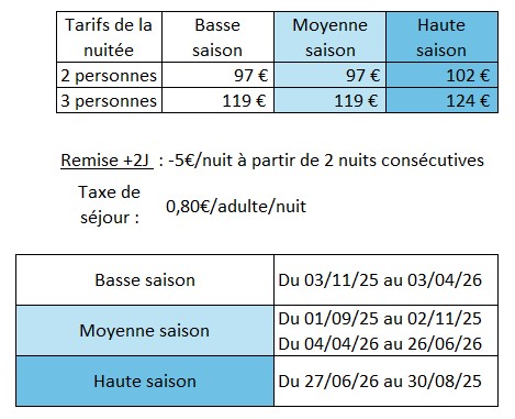 - - 2 nuits minimum : 1er Mai, 8 Mai, Pâcques, Pentecote, Eté