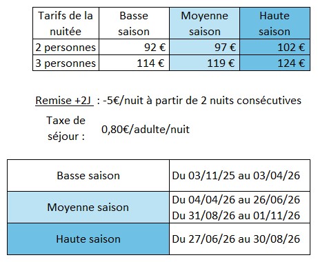 - - 2 nuits minimum : 1er Mai, 8 Mai, Pâcques, Pentecote, Eté