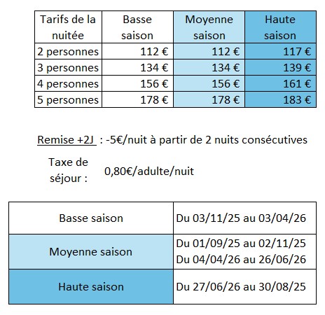 - - 2 nuits minimum : 1er Mai, 8 Mai, Pâcques, Pentecote, Eté